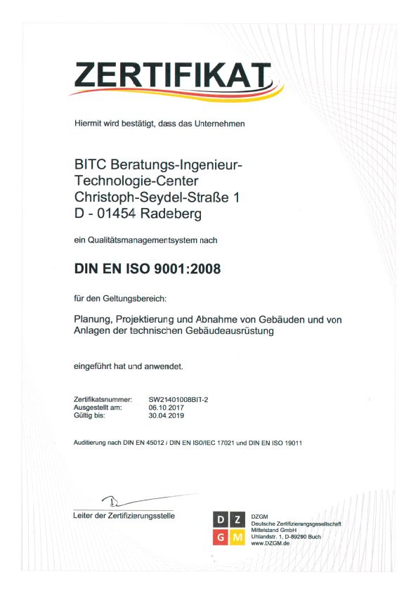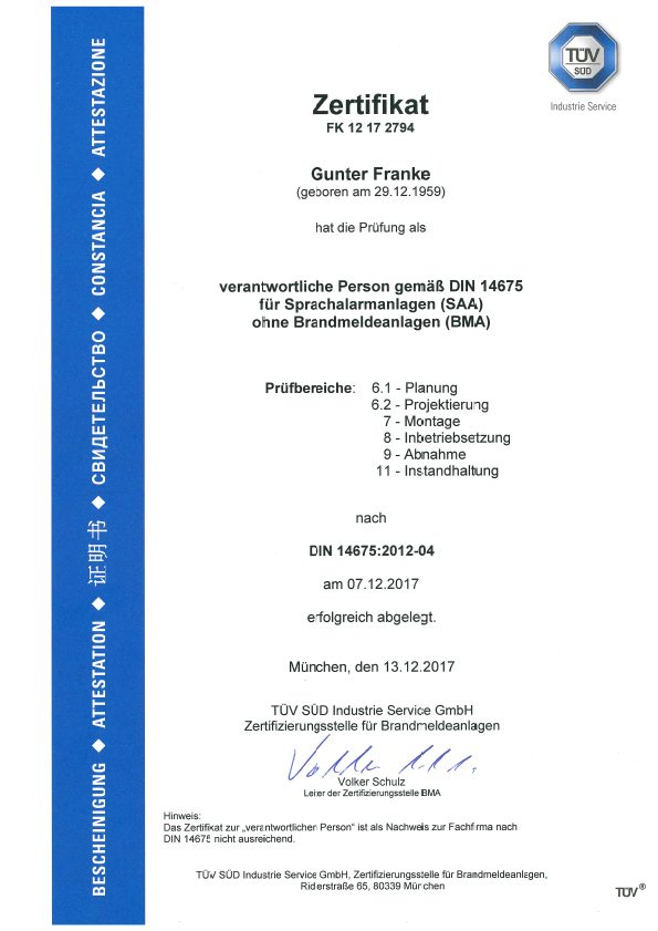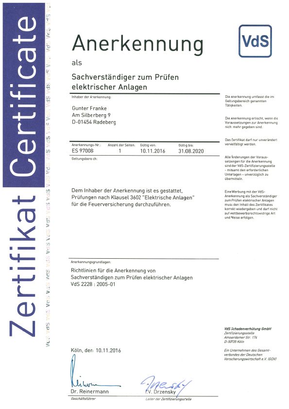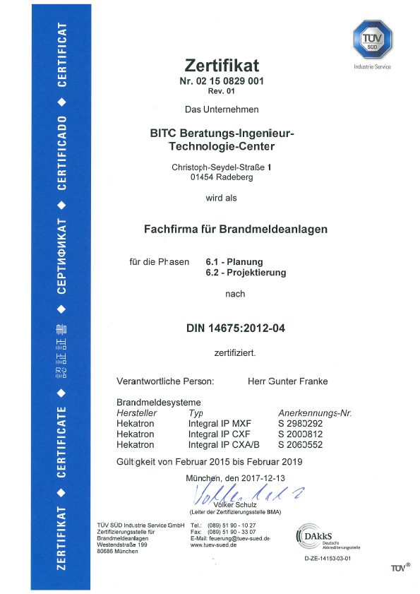1998 wurde unser Spektrum durch die Zulassung von Dipl.-Ing. (FH) Gunter Franke durch den Verband der Schadensversicherer auf die anerkannte Sachverständigentätigkeit für elektrische Anlagen erweitert. Nach der Zertifizierung des Verbands der Schadensversicherer und der Zertifizierung von Herrn Gunter Franke als Planer für Brandmelde- und Sprachalarmanlagen vom TÜV Rheinland weitete sich das Portfolio der BITG auf nachstehende Punkte aus: